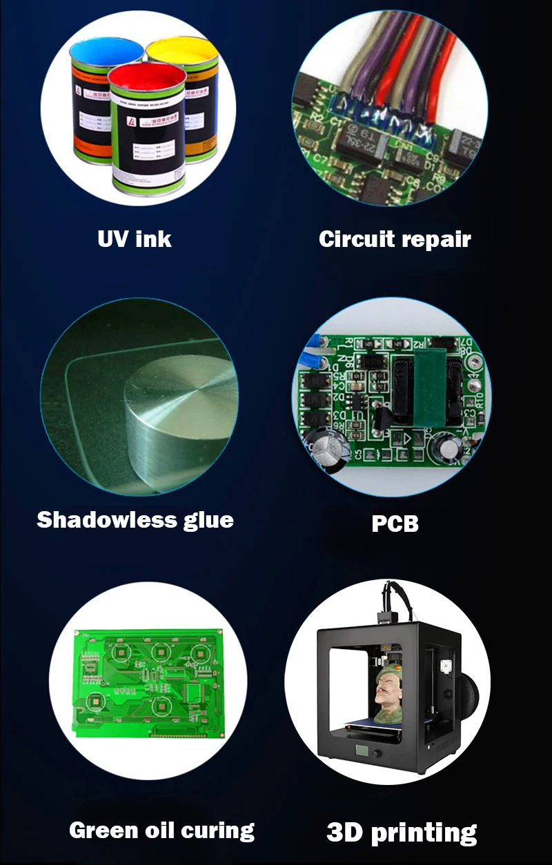 Quick dry UV Curing Ultraviolet LED Lamp Spotlight 365nm 395nm 405nm Solder firm Green oil Circuit board PCB varnish Glue Resin Features: 1.Hand-held design, flexible and convenient to use. 2.Built-in high-speed...